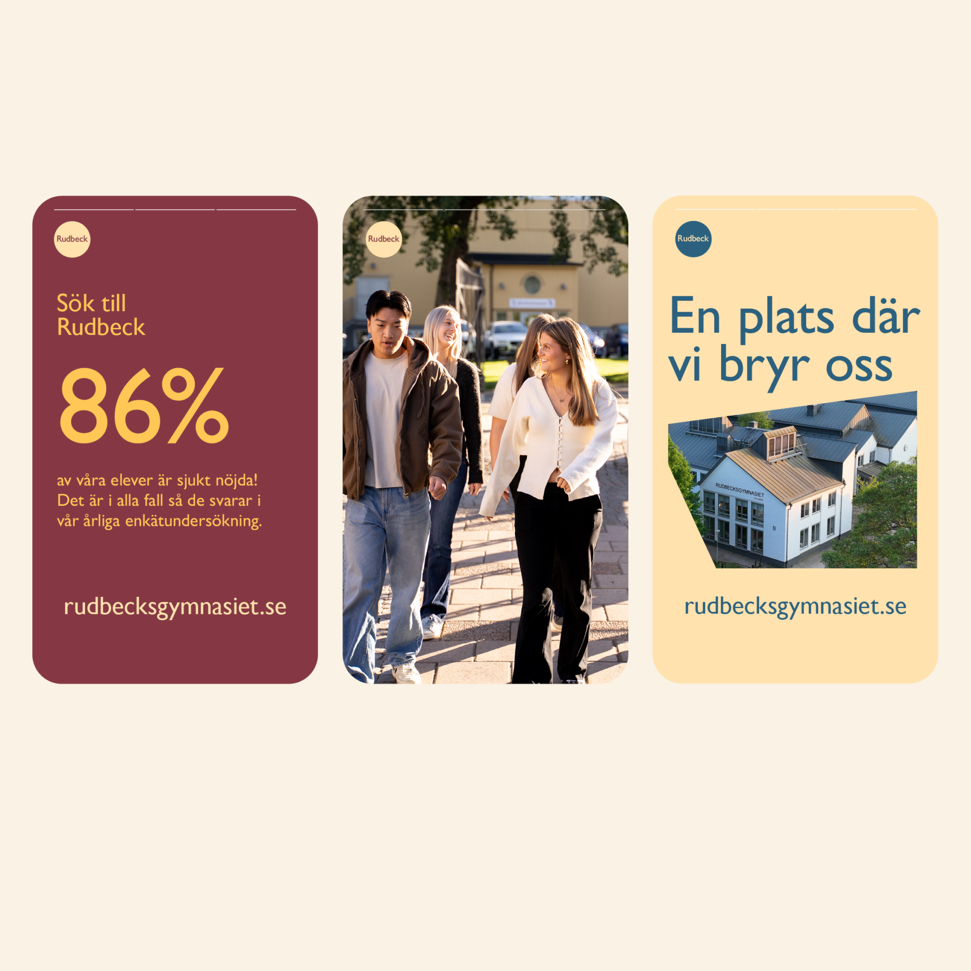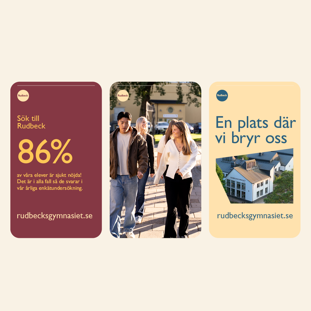 Utöver den kommunikativa plattformen och platsutvecklingen för Rudbecksgymnasiet så har vi gjort en förflyttning i den visuella identiteten. Vi har skapat ett mer enhetligt uttryck, en röd tråd och inspirerande budskap, som dels samlar men också stärker stoltheten både internt och externt. Och gör det enklare i det dagliga arbetet kring verksamheten och den visuella kommunikationen.