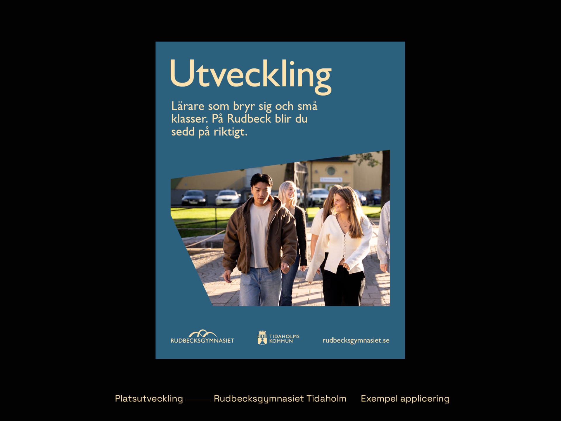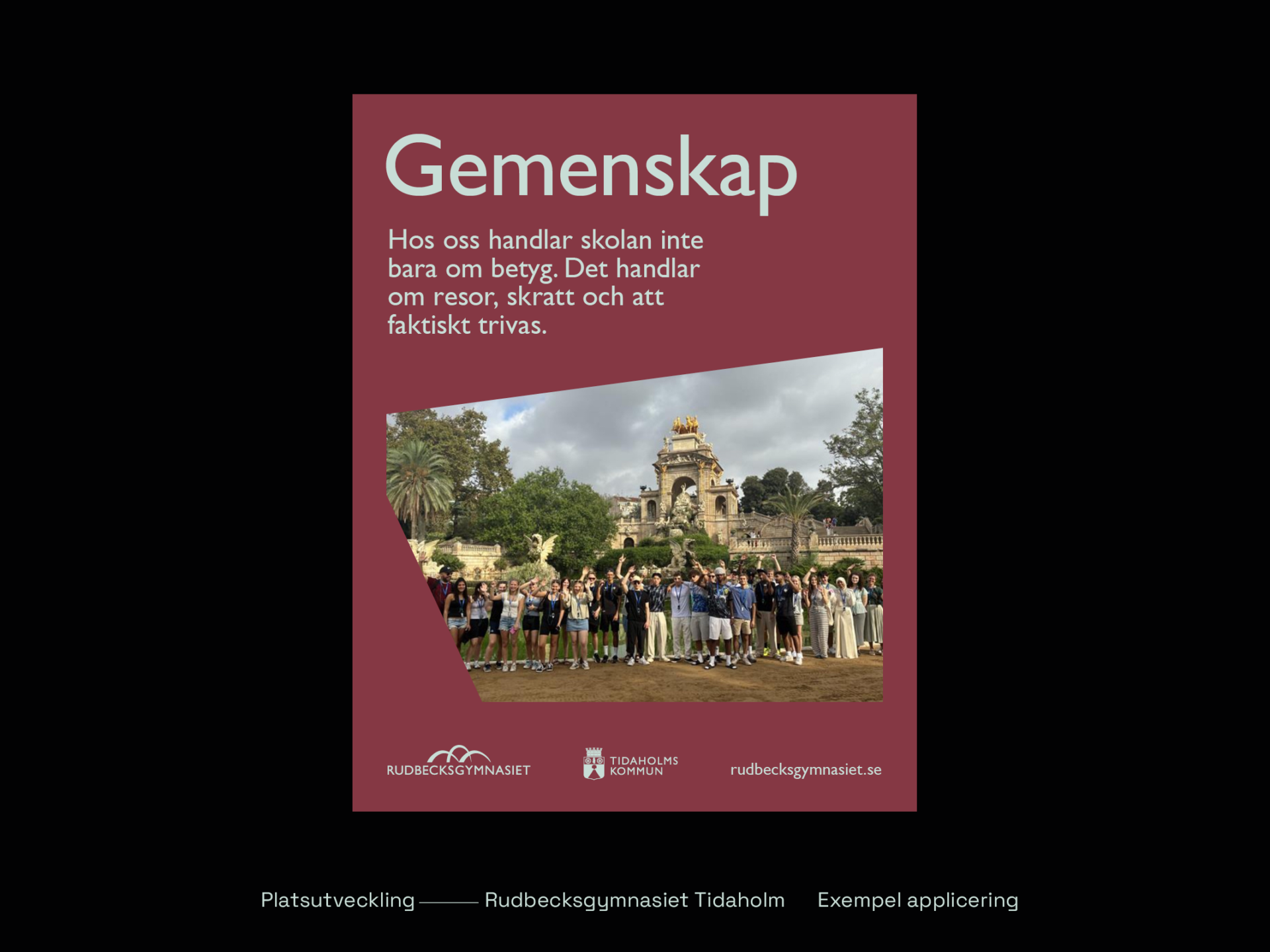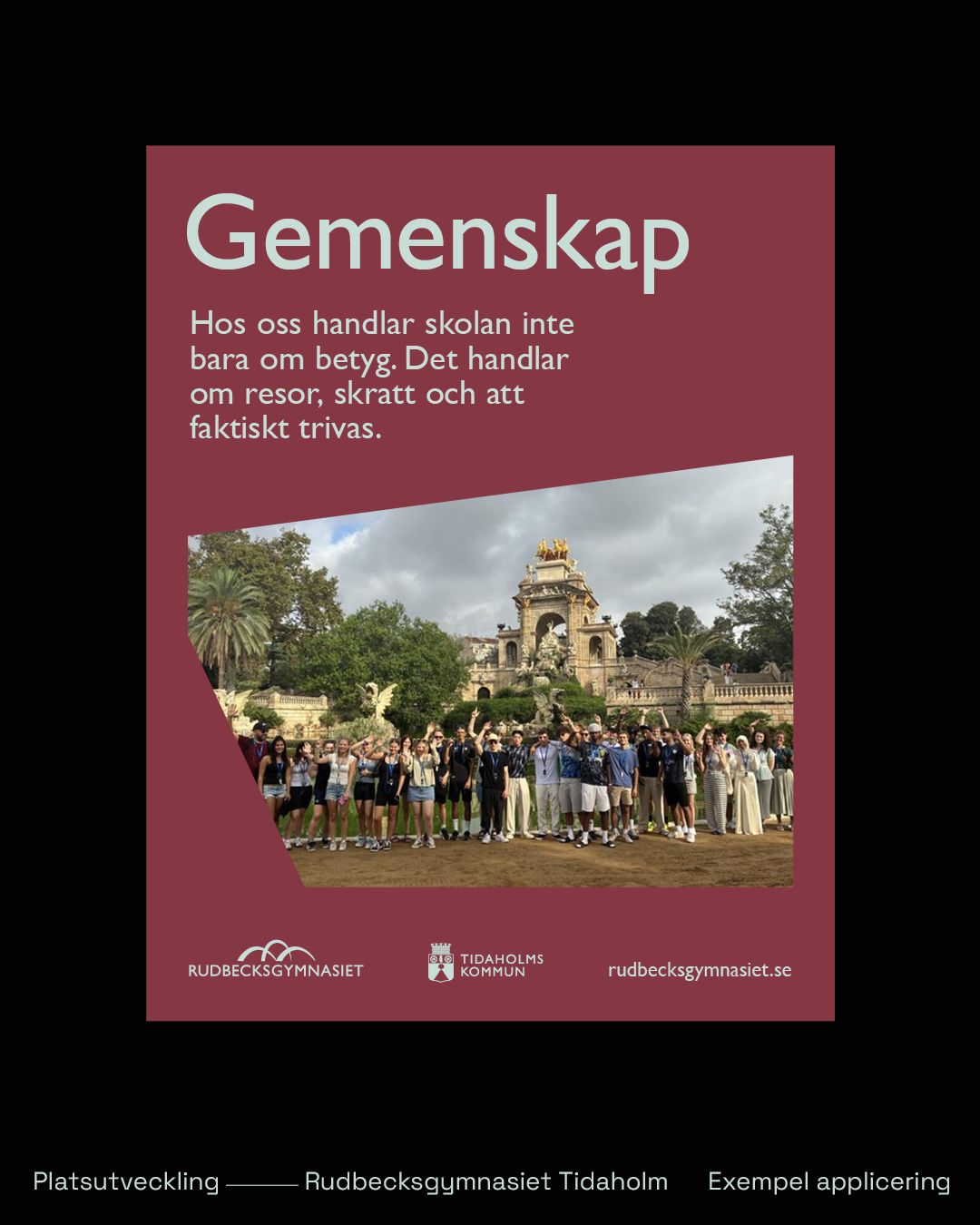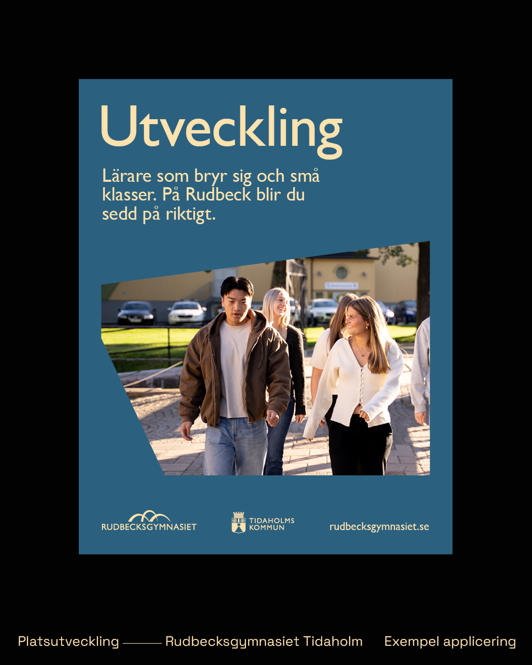 Rudbecksgymnasiet är en del av Tidaholms kommun och samverkar med platsvarumärket Tidaholm. Den visuella förflyttningen möjliggör en särprofilering men samtidigt finns gemensamma nämnare, som stärker den samverkande utvecklingen av Tidaholm som plats. Vi har även justerat den befintliga logotypen och gjort den mer användarvänlig.